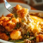 This Tater Tot Hamburger Green Bean Casserole is an easy, comforting dish that brings together creamy mushroom sauce, savory beef, tender green beans, melty cheddar, and crispy Tater Tots in one pan. It is perfect for feeding a family or bringing to a potluck, and it stores and freezes well for make-ahead convenience. For inspiration on classic tater tot casserole techniques, see The BEST Tater Tot Casserole – Mom On Timeout. If you want a similar green bean and tater tot combination with user reviews and tips, check Green Bean Tater Tot Casserole Recipe – Allrecipes. Give this recipe a try, and share how your family enjoyed it.